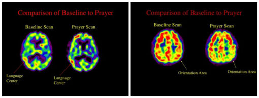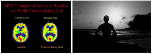 Dr. Andrew Newberg, MD, from Thomson Jefferson University Hospital and Medical College, found differences in brain activity of religiously devout individuals before praying, after praying and of atheist individuals before meditating and after meditating.