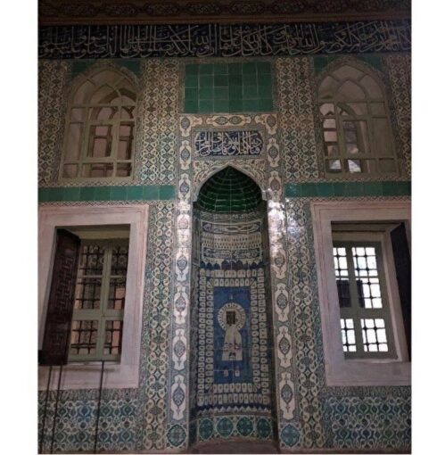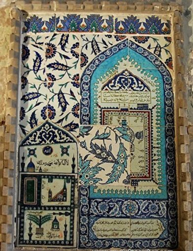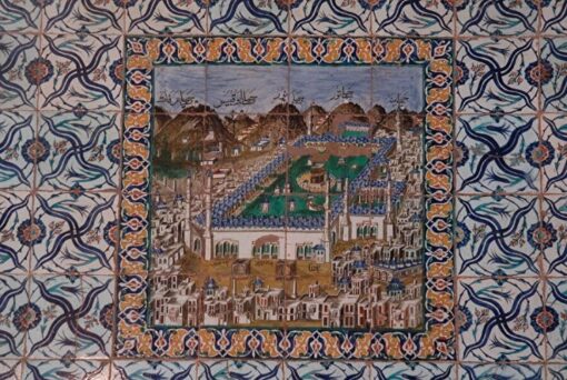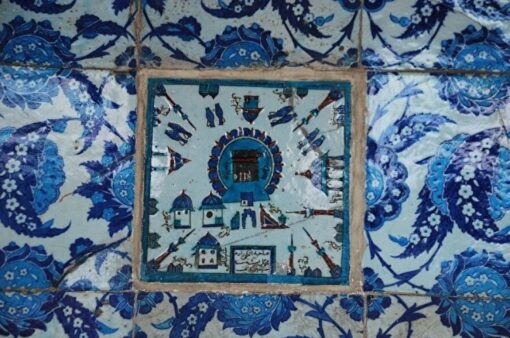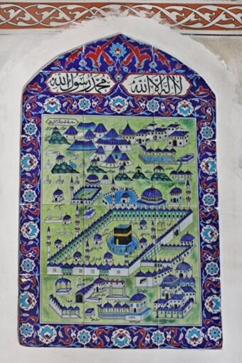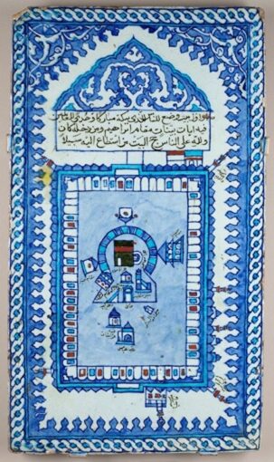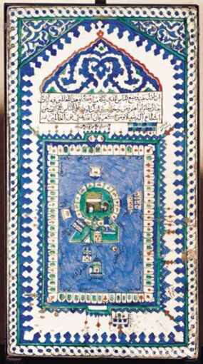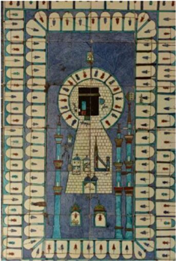 Хотя мастера старались представить саму Каабу на плитках реалистично, они обогащали изображения декоративными элементами. Часто на рисунках святыня предстает в окружении разных построек и видов – арок, города Мекки, гор, домов, а также определенных предметов, призванных служить декоративными элементами – чашеобразных форм, представляющих, вероятно, чаши для воды Замзам, светильников. На изразцовых плитках в гареме дворца Топкапы в Стамбуле светильники изображены подвешенными между двумя минаретами. Встречается и мотив пальмы, который в изображениях Мекки и Каабы является символом бессмертия.