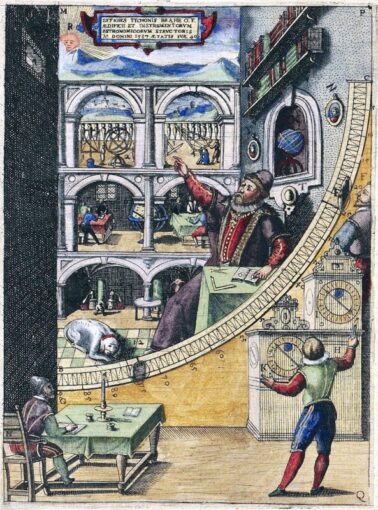 Гравюра с монументального квадранта Тихо Браге в Ураниборге (1598 год) с изображением двух часов / Источник: kb.dk